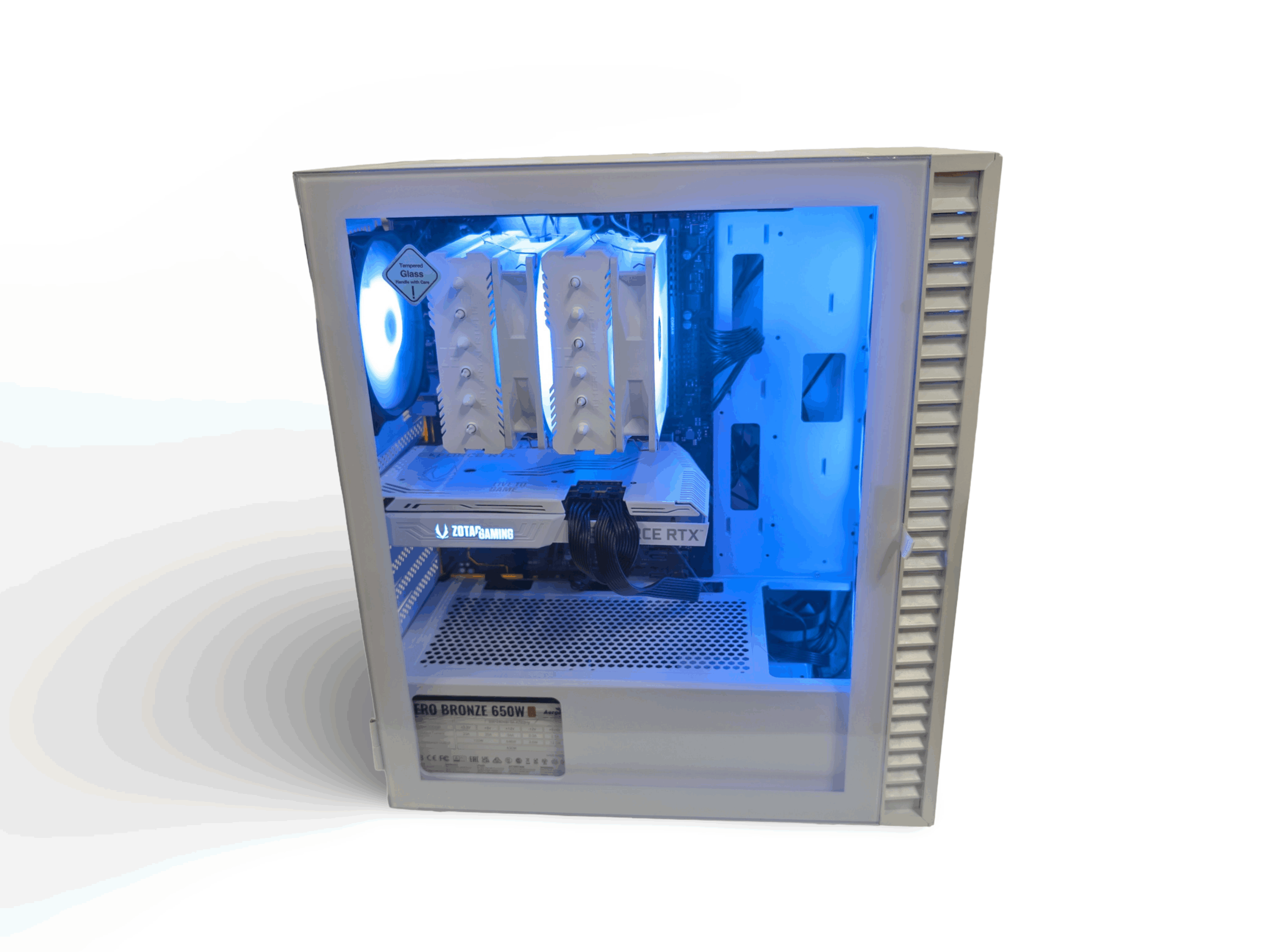 Kuvien mukainen tehokas pelikone. Kotelo, prosessorijäähdytin ja virtalähde ovat uusia.